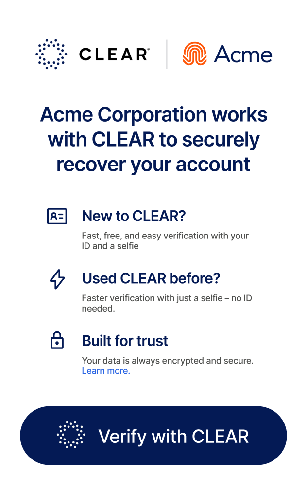 Whether you need to verify your employees or secure customer identity and access management, CLEAR1 helps you manage access securely and intelligently across every environment. Get the benefits of strong identity verification at scale, without compromising the user experience or requiring system overhauls.